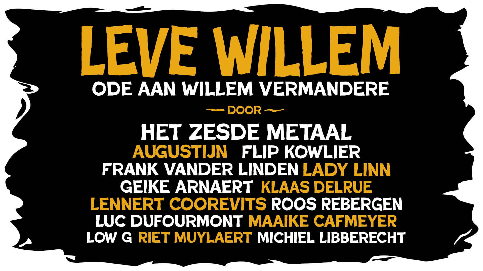 Ook Augustijn, de zoon van Willem Vermandere, die sinds enkele jaren in de voetsporen van zijn vader treedt, is aanwezig. De affiche bulkt voorts van de ronkende namen: Maaike Cafmeyer, Frank Vander linden, Geike Arnaert, Lennert Coorevits, Flip Kowlier, Klaas Delrue enzovoort.