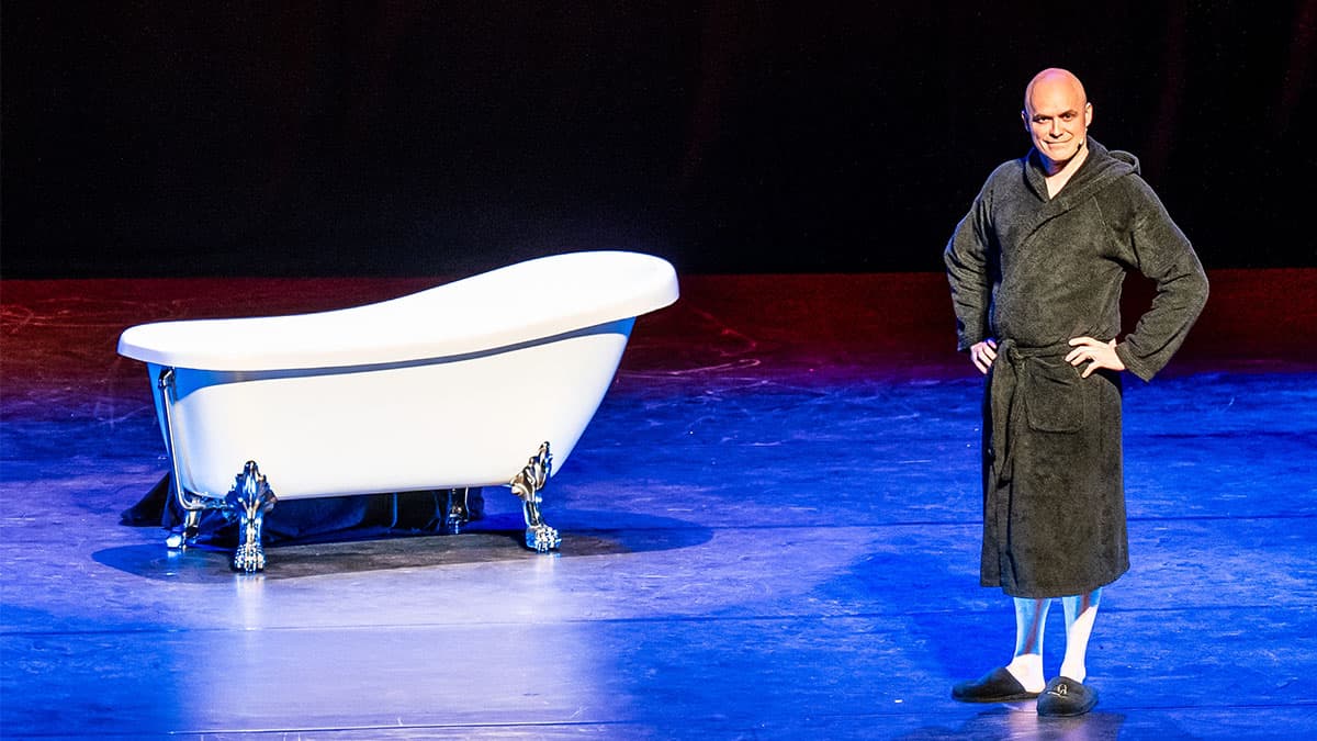 Geubels draaide de onzinkraan volledig open! In zijn nieuwste show nam hij zelfs letterlijk een bad. 🙃